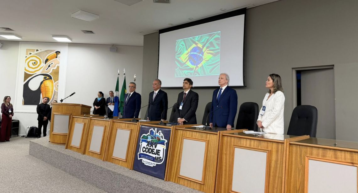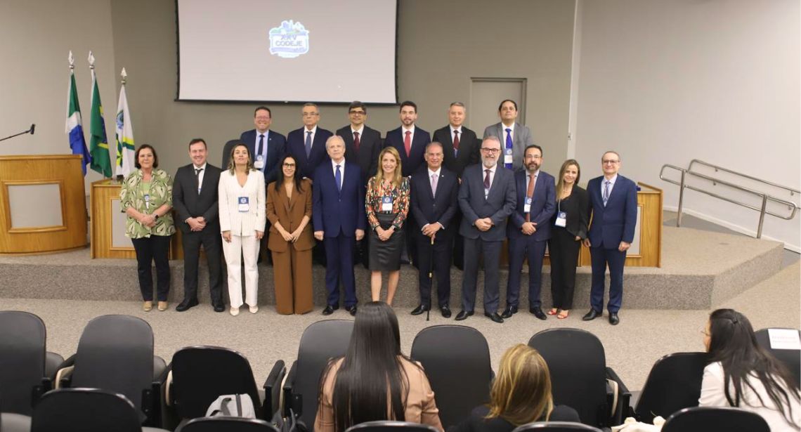 #PraTodosVerem: Na fotografia, aparece um grupo de pessoas formalmente vestidas, posicionadas em duas fileiras sobre um palco de auditório, à frente de um telão que exibe o logotipo do evento “XXV CODEJE”. Ao fundo, veem-se bandeiras oficiais e, em primeiro plano, parte da plateia sentada.